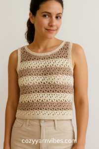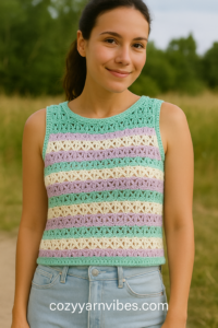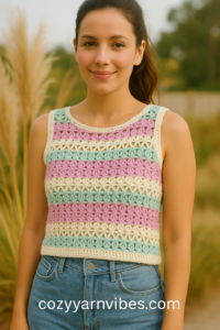 Looking for a breezy, stylish, and super simple summer crochet project? This Lacy V-Stitch Crop Top is perfect for layering over tanks, dresses, or swimwear. With its two-row repeat pattern, it’s a beginner-friendly yet chic addition to your handmade wardrobe.