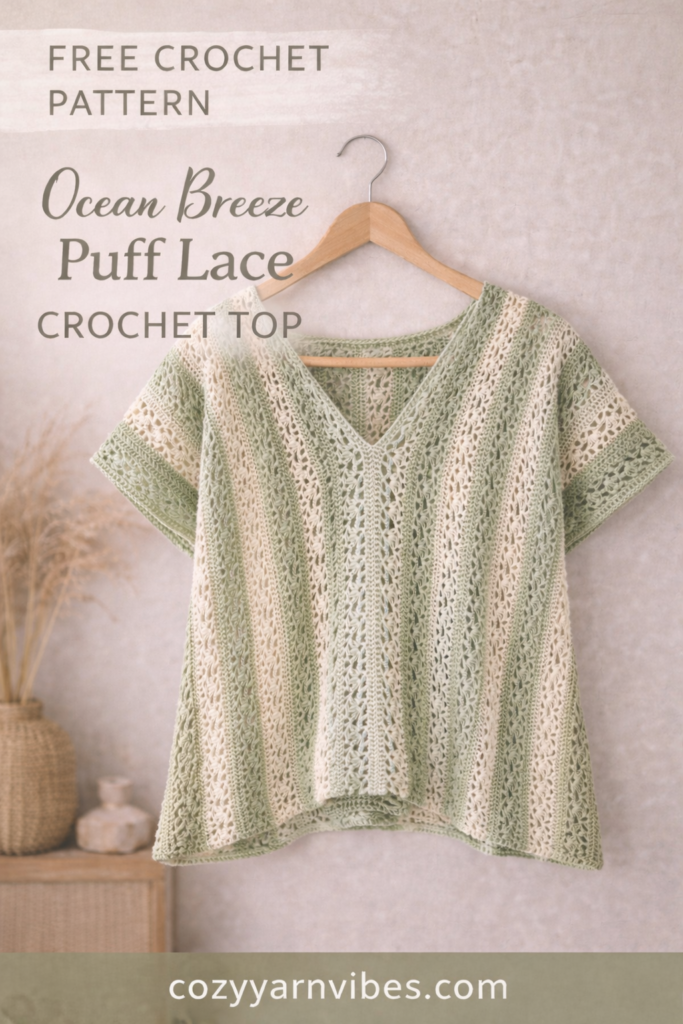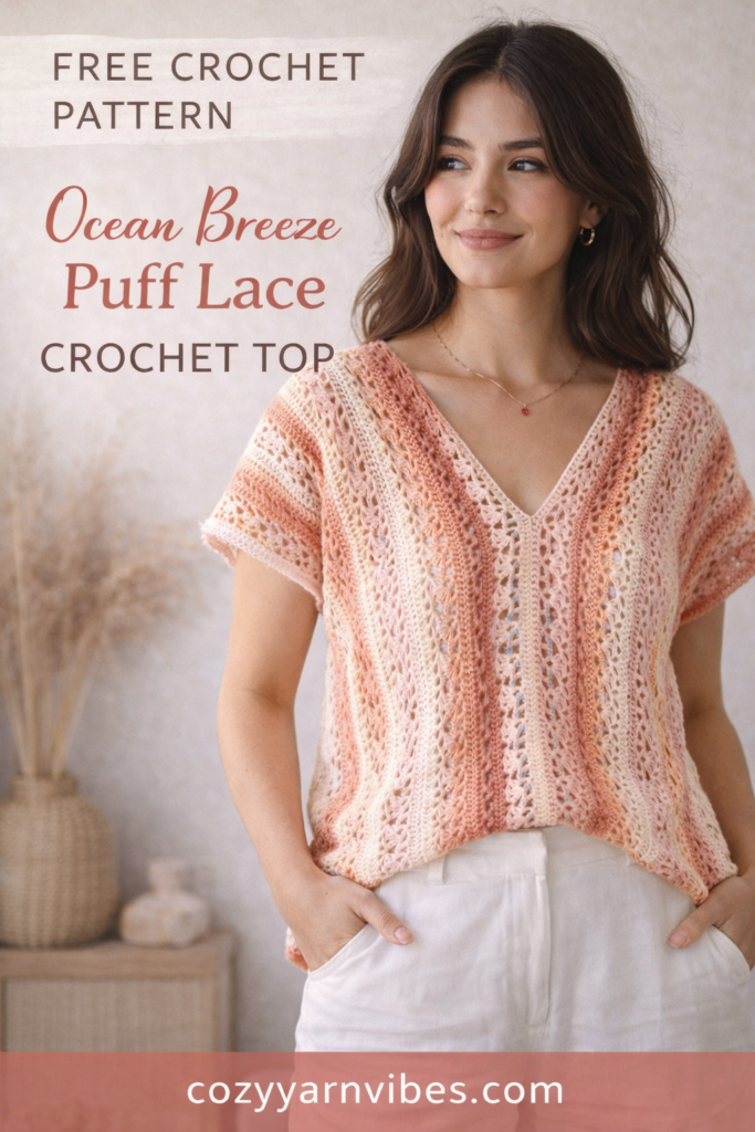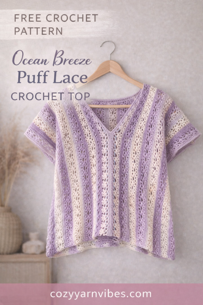 If you’re looking for a flowy, airy crochet top that feels elegant but is still beginner-friendly, this Ocean Breeze Puff Lace Top is the perfect project.
